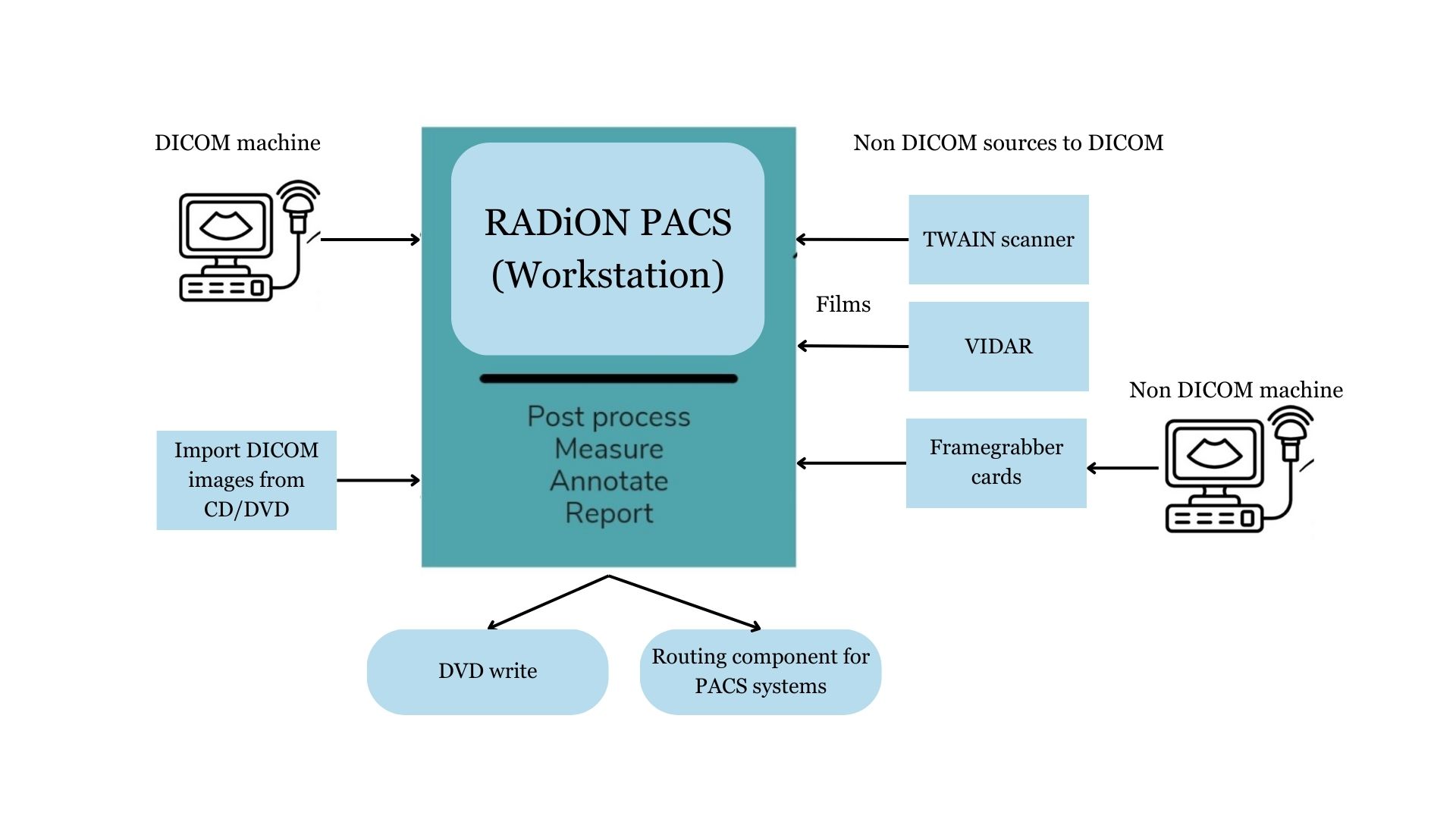 - The RADiON server stores all image data and provides DICOM query support to requests from other workstations or PACS systems on the LAN.